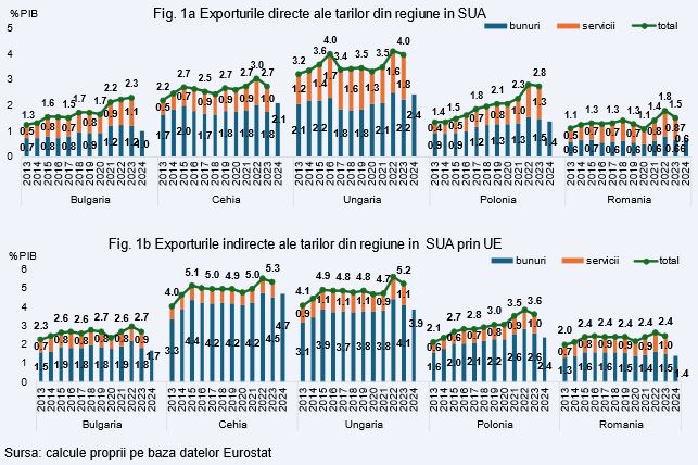 În România exporturile directe în SUA au crescut ușor ca procent în produsul intern brut (PIB) de la 1,1% în 2013 la 1,5% în 2023 (Fig. 1a).