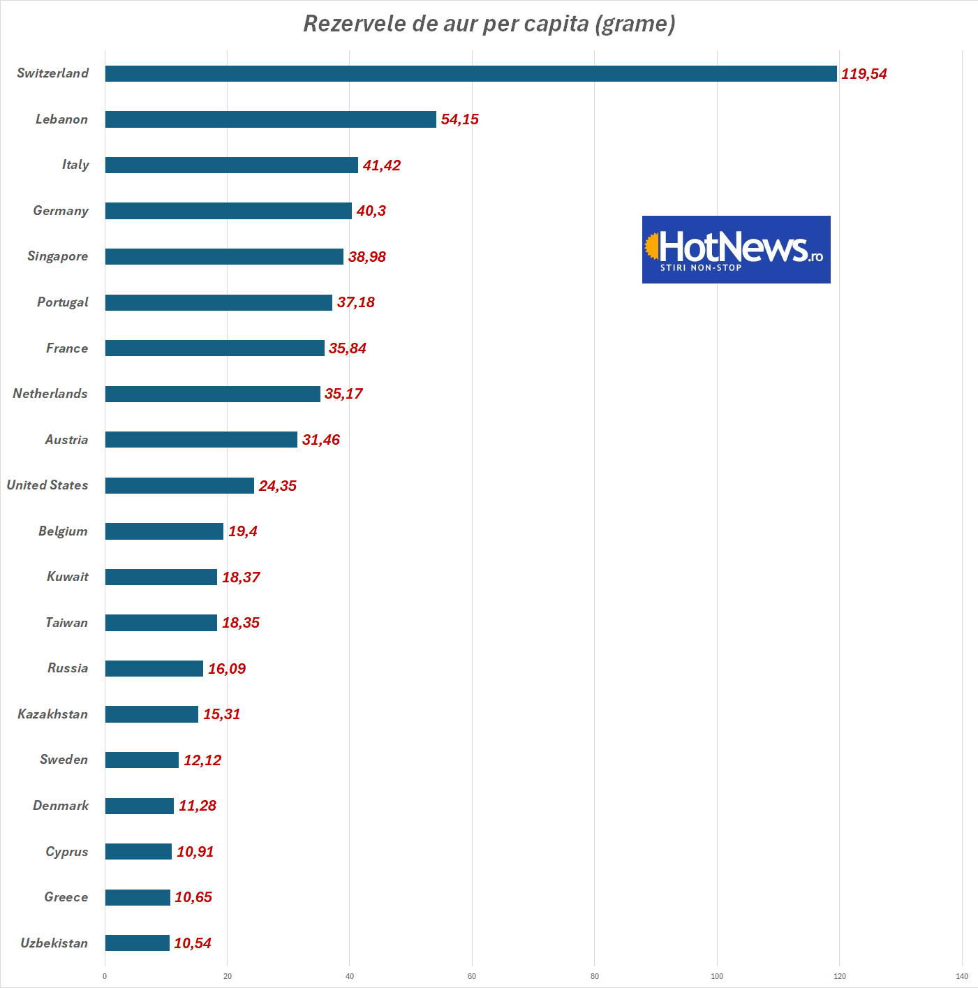 Mai jos, țările cu o rezervă de aur de peste 10 grame/locuitor