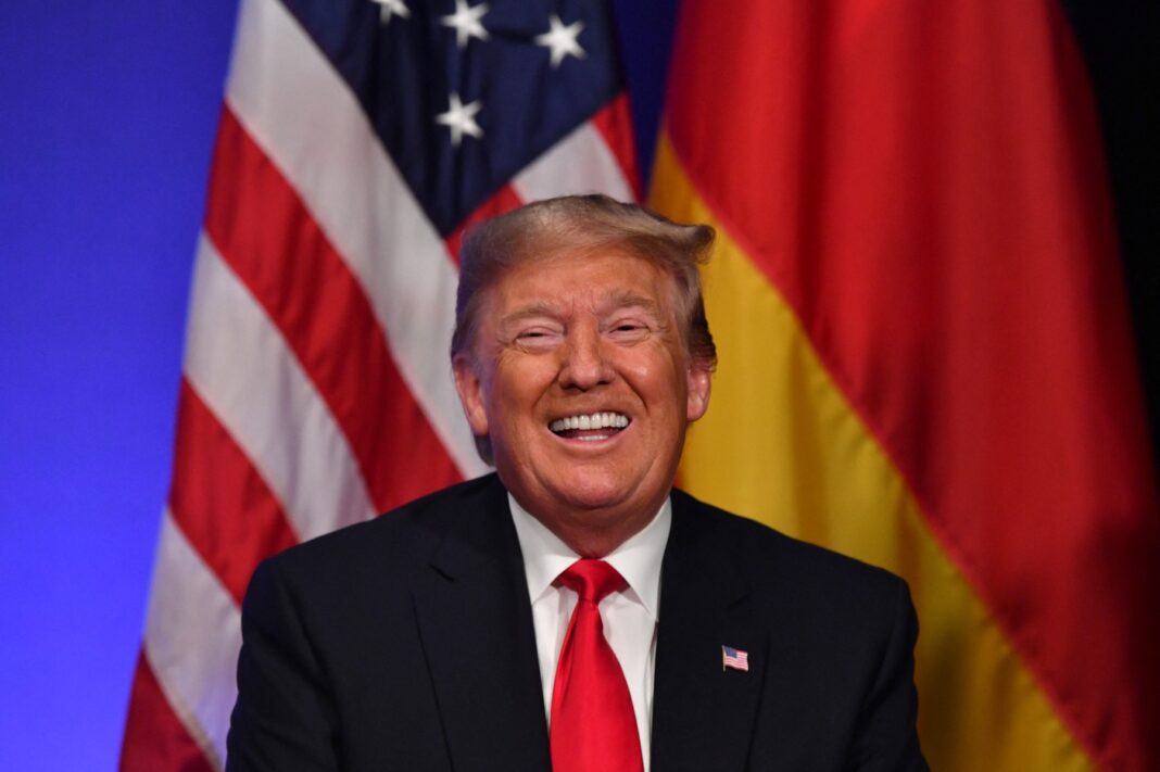 Donald Trump fotografiat în fața steagurilor SUA și Germaniei în decembrie 2019, când a avut o întâlnire bilaterală cu fostul cancelar Angela Merkel în marja summitului NATO ce a avut loc atunci, FOTO: Nicholas Kamm / AFP / Profimedia