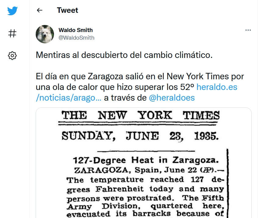 Una dintre cele mai virale postări de pe rețelele sociale din ultimele săptămâni este o captură de ecran cu un articol publicat de The New York Times în ediţia sa din 23 iunie 1935, conform căruia o temperatură de „127 grade Fahrenheit”, adică 52,7 grade Celsius, ar fi fost atinsă cu o zi înainte la Zaragoza, în nord-estul Spaniei.