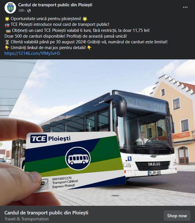 „Operatorul Local de Transport SC TCE SA doreşte să informeze publicul larg despre apariţia unor tentative de fraudă în mediul online, care utilizează în mod neautorizat numele şi identitatea vizuală a companiei noastre. Am fost informaţi despre existenţa unor postări pe reţelele sociale care solicită cetăţenilor să furnizeze informaţii personale sau financiare, sub pretextul oferte speciale sau achiziţii de bilete în numele SC TCE SA. Un cont fals de Facebook, care nu reprezintă Societatea Transport Calatori Express SA , promovează vânzarea de carduri de călătorie tip abonament de 6 luni pentru suma de 11,75. Pentru a părea cât mai credibil anunţul, pe pagina respectivă există şi comentarii false. Vă anunţăm pe această cale este vorba de o tentativă de fraudă în numele Transport Calatori Express SA şi vă recomandăm să nu accesaţi link-ul postat în anunţ”, a transmis, marţi, reprezentanţii companiei de transport public din Ploieşti.