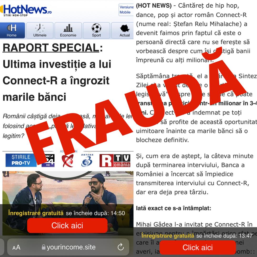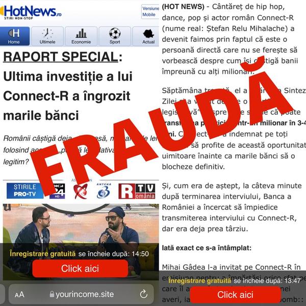 - „În acest caz, site-ul yourincome[.]site impersonează HotNews.ro cu scopul de a oferi o doză de veridicitate informației prezentate. Așa cum se poate observa și din imagini, domeniul în cauză nici măcar nu are în adresă numele publicației de a cărui imagine și reputație se folosesc atacatorii.