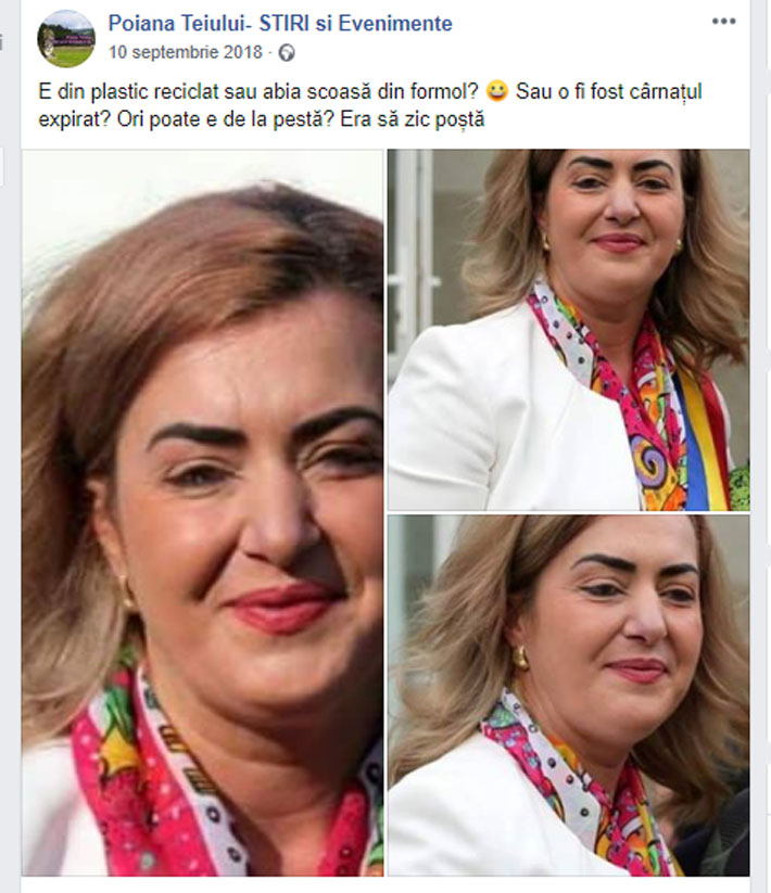 Al treilea exemplu de postare este de o răutate ieșită din comun. Anonimii din spatele acestei pagini jignesc și hărțuiesc în cel mai josnic mod o femeie, adică primărița de la Poiana Teiului, dar fără să o acuze de nimic. O hărțuiesc pur și simplu.