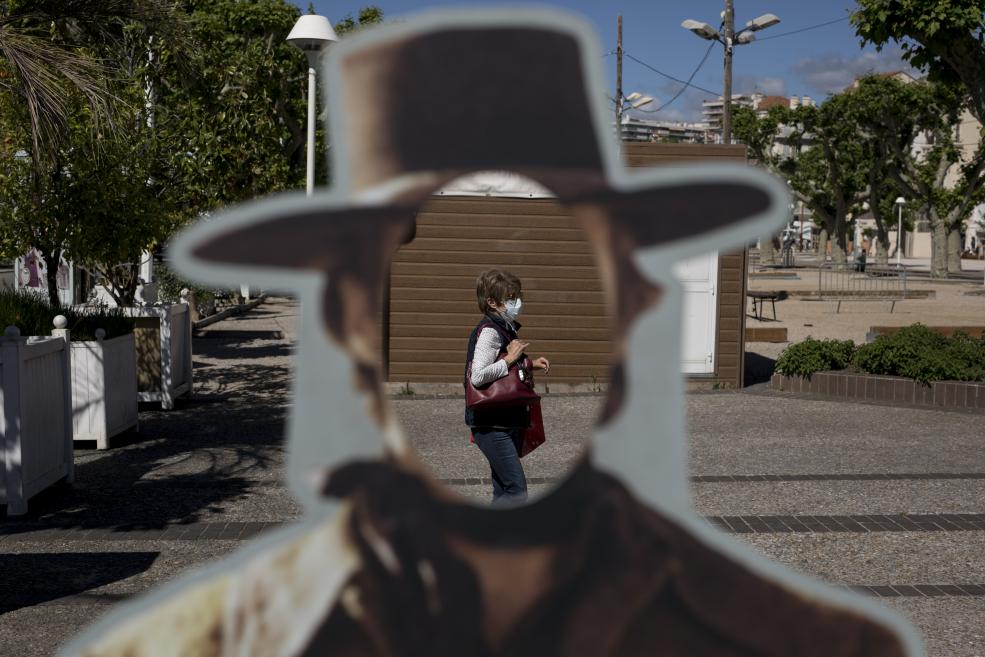 Femeie trecând prin spatele unui decupaj de carton reperezentându-l pe Clint Eastwood din Cannes, Franța. (AP Photo / Daniel Cole):
