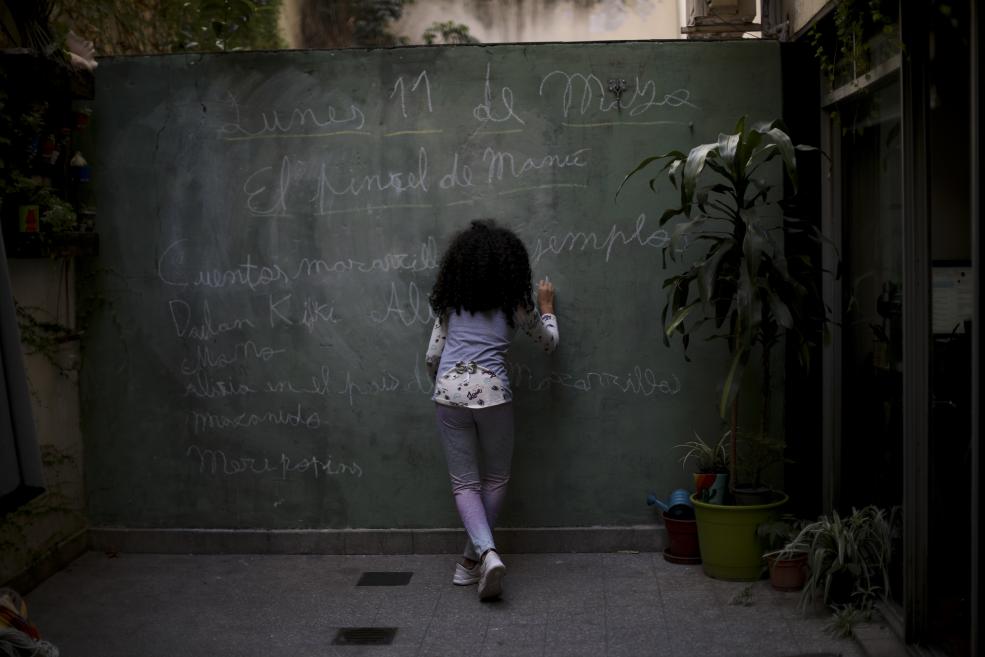O fată folosește un perete drept tablă de școală în Buenos Aires. (Foto AP / Natacha Pisarenko):