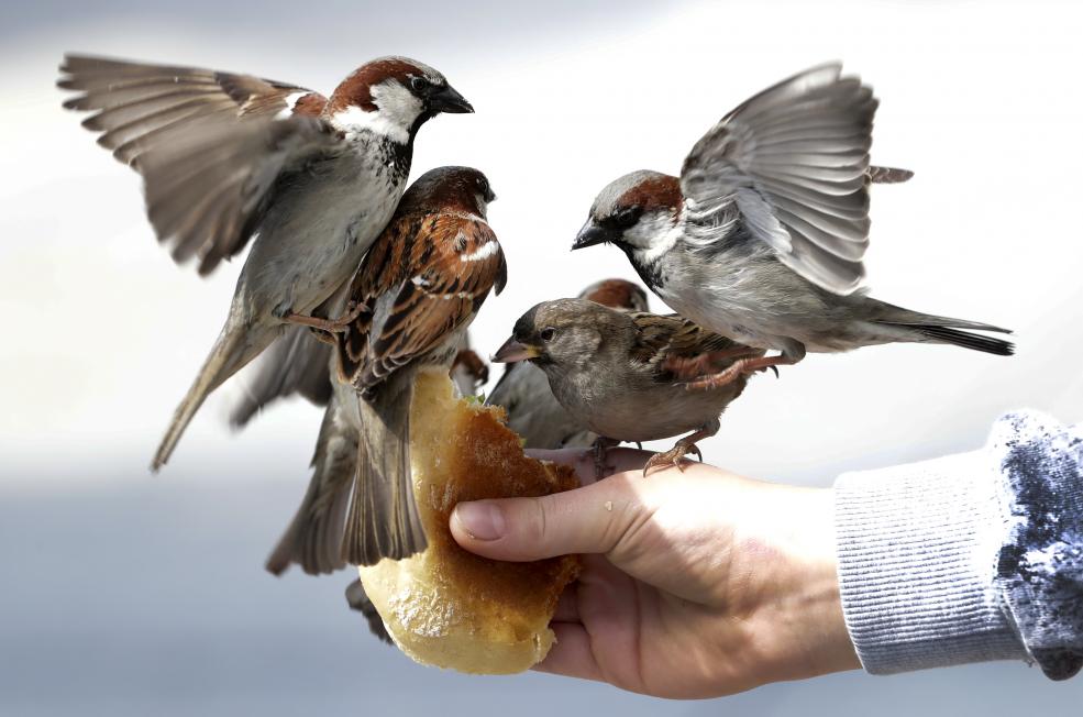 Băiat hrănind vrăbii în Berlin (AP Photo/Michael Sohn):