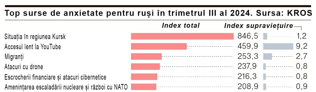 În cel mai recent raport al companiei de comunicații ruse KROS, intitulat ”Indexul național al anxietății”, realizat pe baza rezultatelor celui de-al treilea trimestru al anului 2024, primele temeri ale rușilor sunt:
