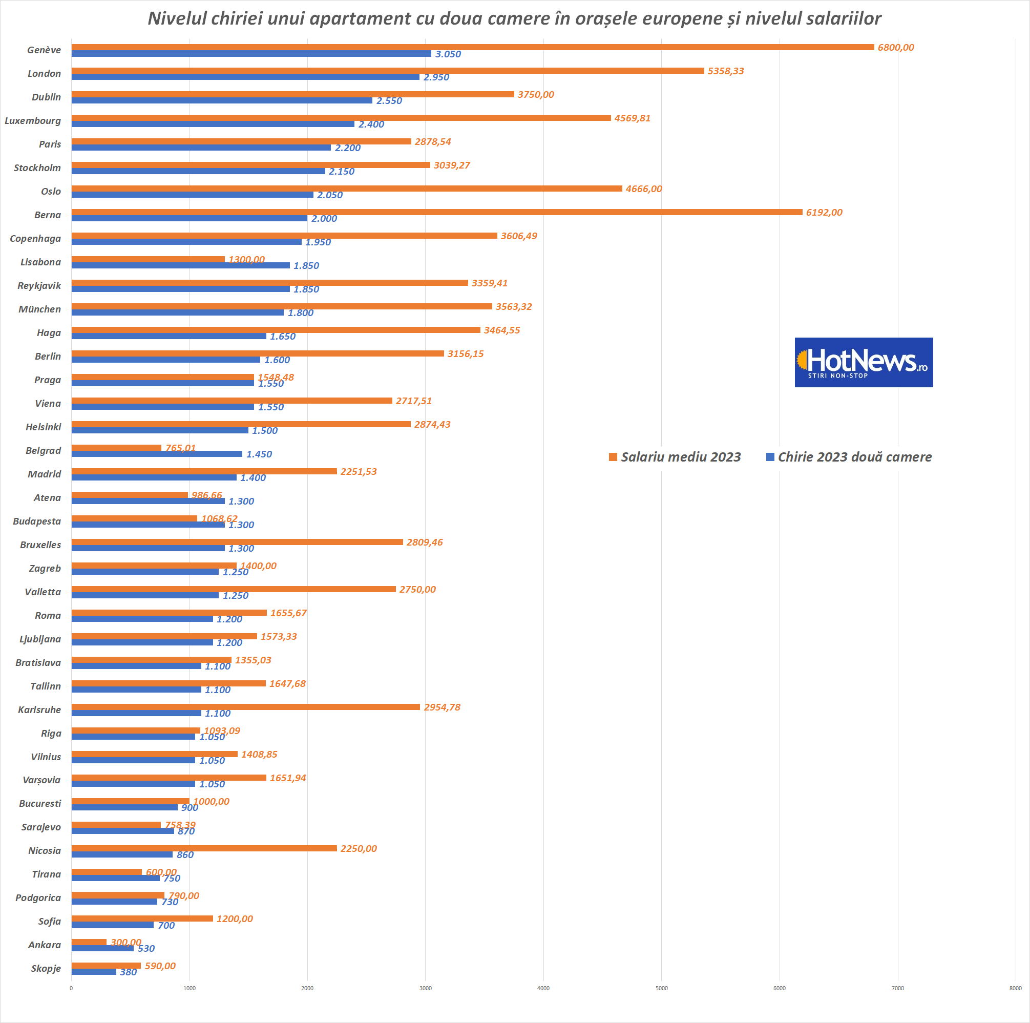 Cifrele sunt publicate în euro pentru coerență și arată că în 3 orașe să închiriezi o garsonieră te costă peste 2000 de euro lunar : Geneva, Londra și Dublin, iar în alte 15 cazuri chiria e între 1000-2000 de euro.