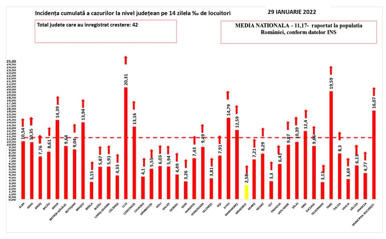 Nu mai puțin de 23 județe, aproape o jumătate din total, au raportat peste 400 de cazuri de îmbolnăviri cu COVID-19 în ultimele 24 de ore. Capitala raportează cel mai mare număr de cazuri noi, aproape 6.300, urmată de Timiș cu aproape 1.800, Brașov cu 1.700 și Cluj cu peste 1.400, dar și alte șapte județe cu circa 1.000 de cazuri noi. Rata de infectare cu noul coronavirus la nivel național a crescut la 11.71, toate județele înregistrând creșteri de pe o zi pe alta. Un singur județ e în scenariul galben.