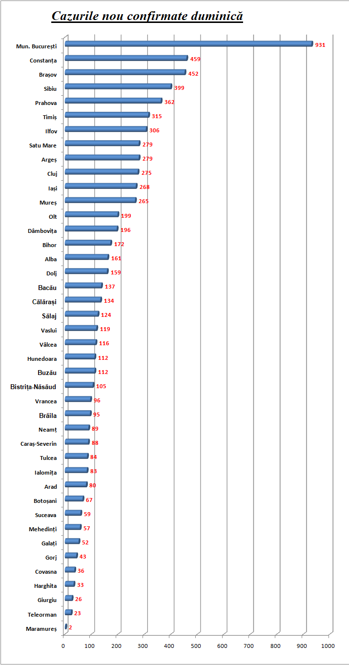 Un număr de 12 județe au depășit pragul de 200 de noi infectări, potrivit raportării de duminică a Grupului de comunicare Strategică. București u fost înregistrate 931 de noi infectări, urmat de Constanța- 459, Brașov,- 452 și Sibiu- 399 cazuri noi.