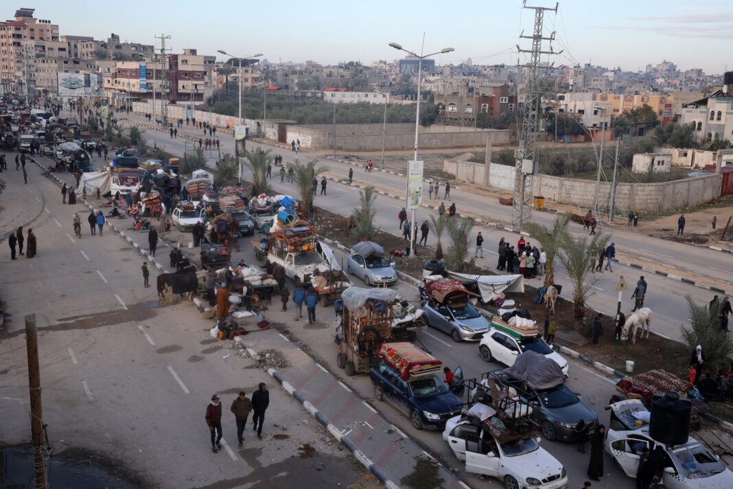 Palestinienii strămutați așteaptă de-a lungul drumului Salah al-Din din Nuseirat, lângă coridorul blocat Netzarim, pentru a traversa partea de nord a Fâșiei Gaza pe 26 ianuarie 2025. Credit line: Eyad BABA / AFP / Profimedia