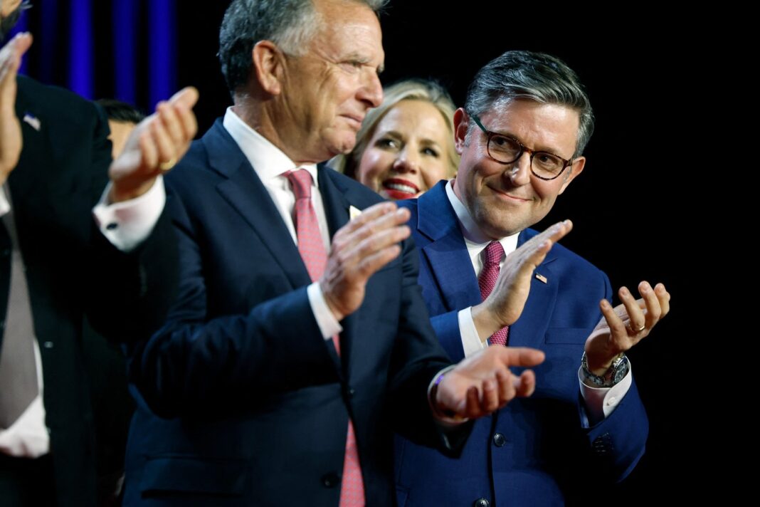 Mike Johnson, actualul lider republican al Camerei Reprezentanţilor, sărbătorind victoria lui Donald Trump. Credit foto: Chip Somodevilla / Getty images / Profimedia