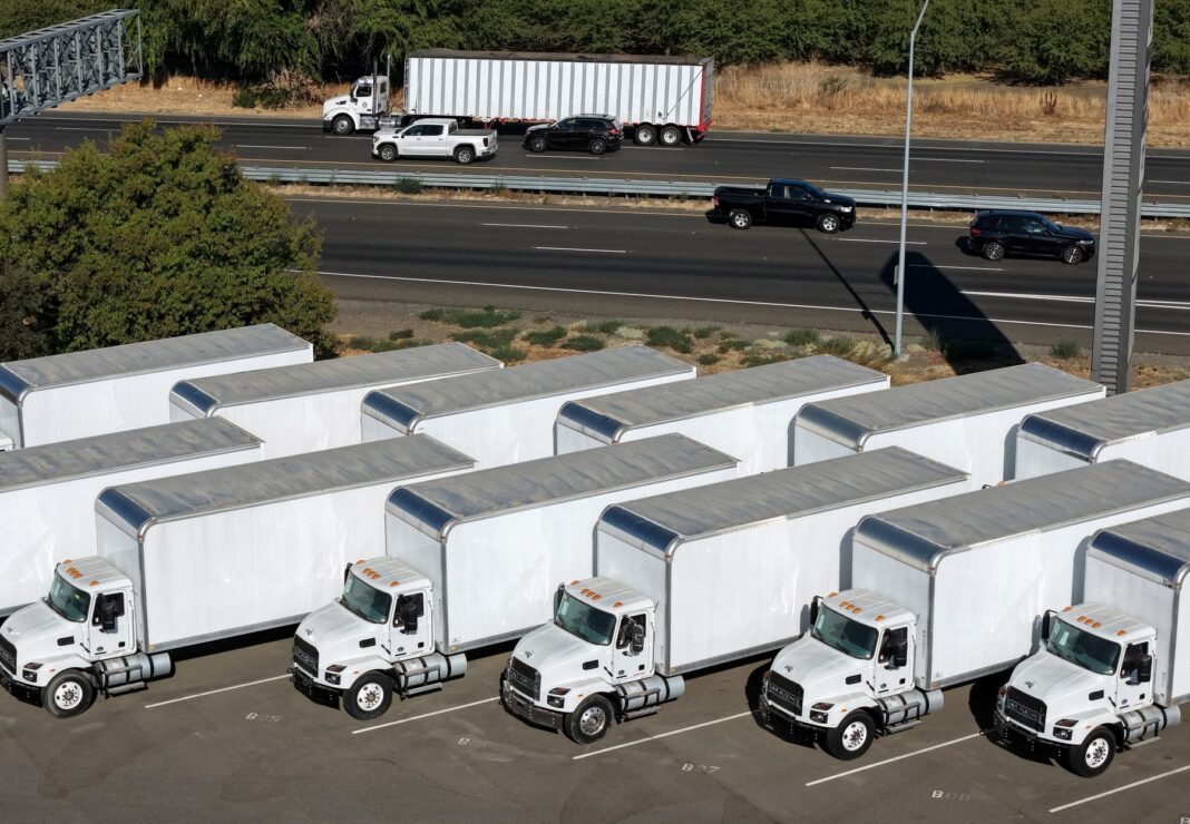 Camioane noi sunt expuse la TEC Equipment, pe 26 septembrie 2025 în Dixon, California, SUA.