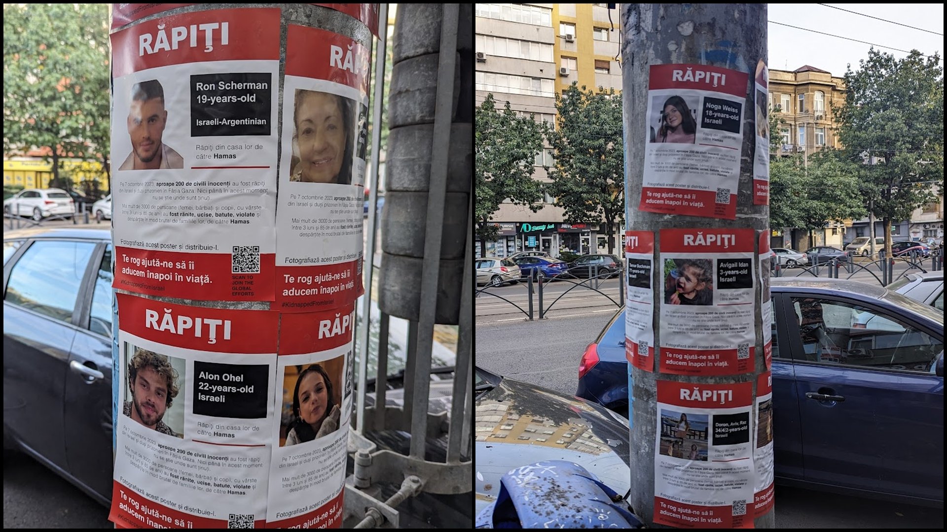 Afișe cu israelieni răpiți de Hamas, lipite în BucureștiFoto: Hotnews