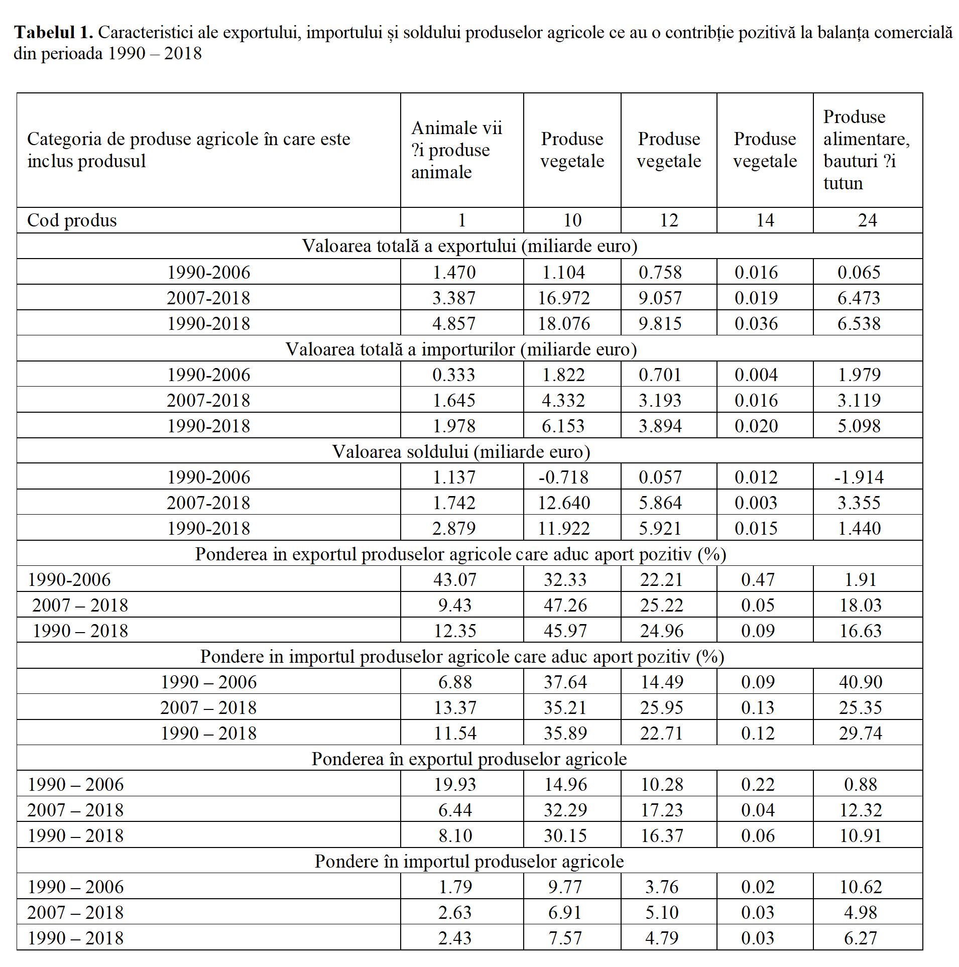 Într-o țară cu un potențial agricol mare, cum este cazul țării noastre, vom constata că la nivelul întregii perioade 1990 – 2018 numai cinci produse au marcat un aport pozitiv la balanța comercială cu produse agricole: Animale vii (cod 1), Cereale (cod 10), Semințe și fructe oleaginoase, plante industriale și medicinale, paie și furaje (cod 12), Materiale pentru împletit și alte produse de origine vegetală (cod 14) și Tutun și înlocuitori de tutun (cod 24). Lista acestor produse cu un aport pozitiv este un argument în plus că România este o țară cu un potențial natural mare, dar nevalorificat prin dezvoltarea industriei agro-alimentare. Cu excepția ultimului produs, celelalte patru sunt obținute în prima fază a procesului de producție din agricultură, fiind produse neprelucrate, cu o valoare de piață mică.