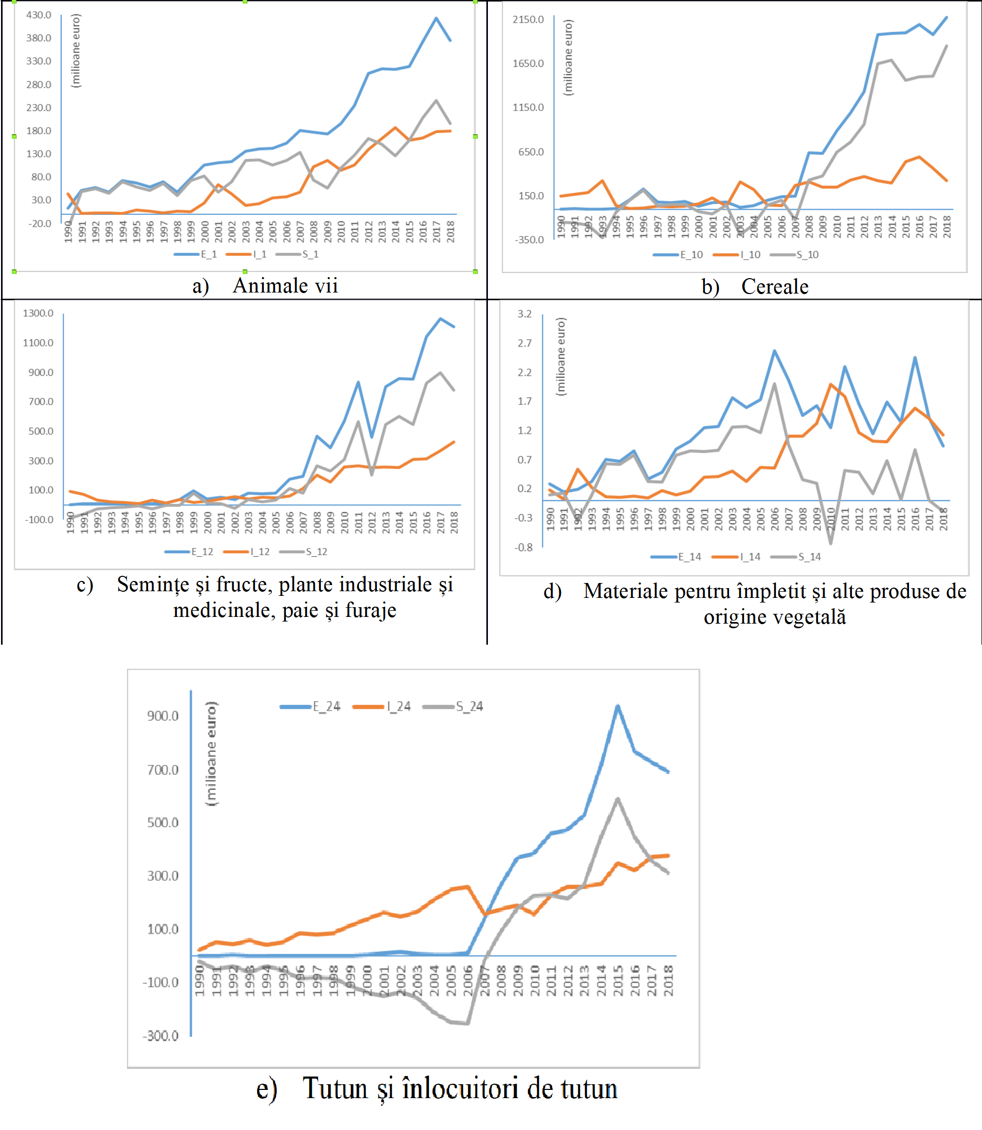 Dacă pe ansamblul perioadei, cele cinci produse au avut un aport pozitiv la balanța comercială a României, pe perioade mai scurte, fiecare dintre acestea a avut o evoluție diferită. Cel mai bun exemplu este în cazul exportului și importului de tutun și înlocuitori de tutun, care a devenit de la un produs cu aport negativ mare asupra balanței comerciale în perioada de pre-aderare, la un produs cu aport pozitiv asupra balanței, în perioada de post-aderare. Pentru a surprinde și aceste fluctuații, nu numai de la o perioadă la alta, dar și de la un an la altul, în graficele din figura 2 sunt prezentate evoluțiile anuale pentru exportul, importul și soldul comercial la cele cinci produse.