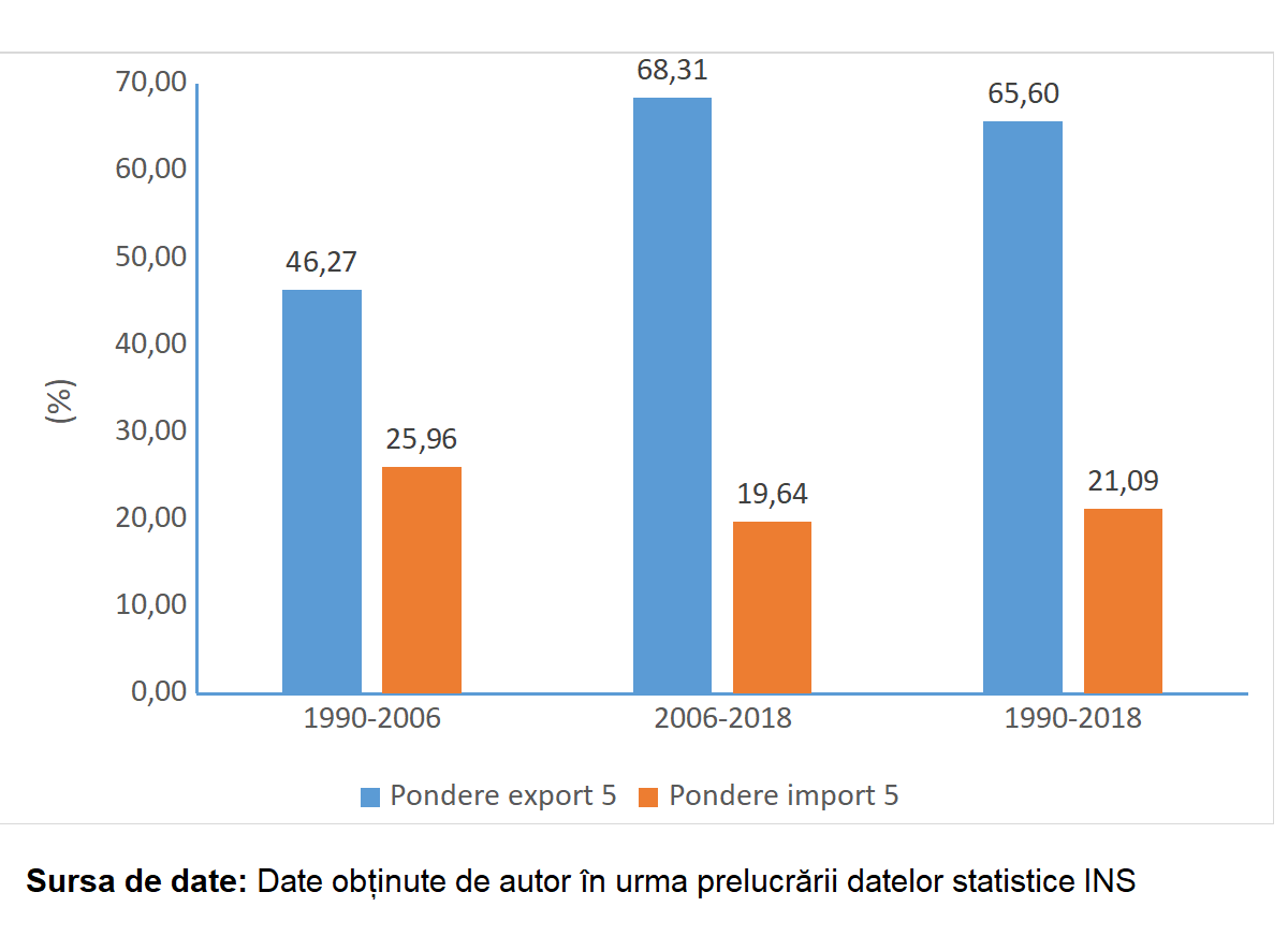 Volumul total al exportului celor cinci produse în volumul total al exportului de produse agricole reprezintă mai mult de 65%. Această pondere, calculată separat pentru perioada de pre-aderare și pentru cea de post-aderare, scoate în evidență o creștere în importanța comerțului exterior cu produse agricole după aderare (figura 1). Ponderea mare a acestor produse (68%) în exportul produselor agricole atribuie celor patru (1, 10, 12 și 24) poziții strategice în exportul de produse agricole al României. Aceste produse asigură reducerea deficitului balanței comerciale a României. Din păcate, producția anuală a acestora este influențată de condiții climatice și de momentul vânzării post – recoltare funcție de cererea la nivel mondial. Mai mult, acestea sunt produse neprelucrate, cu valoare de piață mică. Valoarea acestora crește numai în măsura în care sunt supuse unui proces de prelucrare pentru obținerea de produse alimentare sau urmare a unor prelucrari industriale.