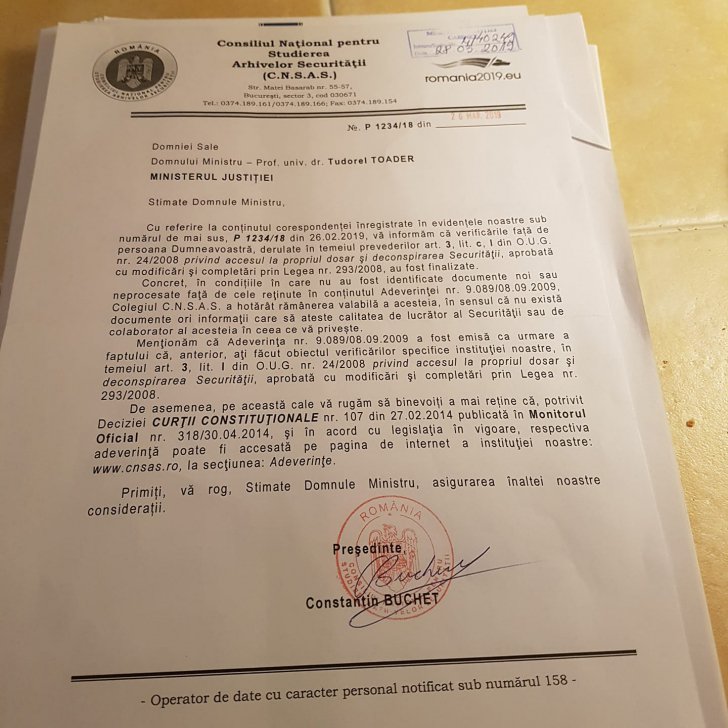 Ministrul Justiției a reacționat pe Facebook, în această seară: „Intelegand faptul ca se solicita verificarea mea de catre CNSAS, postez recenta comunicare, din 26 martie 2019, in urma ultimei verificari, probabil cea de a patra !”