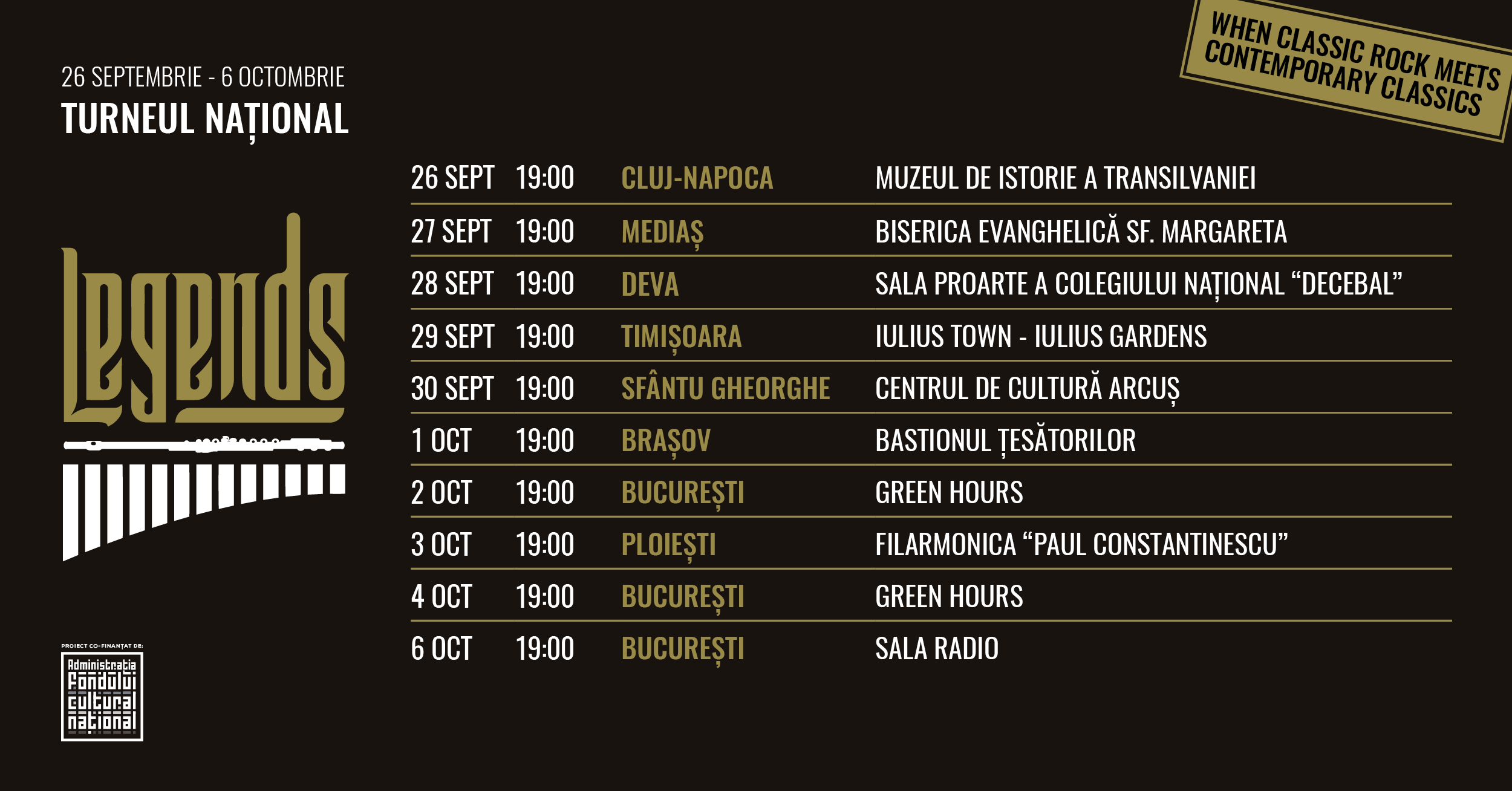 Led Zeppelin, Metallica, Iron Maiden, Aerosmith, Nirvana, Depeche Mode, Deep Purple, Guns N’ Roses, sunt doar câteva dintre marile ”legende” prezentate într-un program electrizant de cea mai înaltă ținută. Cu un concept în care Classic Rock Meets Contemporary Classics,“Legends” este inovator, atractiv și emoționant depotrivă, fiind dezvoltat împreună cu compozitori contemporani români și străini, pentru o formulă camerală unică în România – flaut, marimbă și vibrafon. Protagoniștii turneului sunt deja cunoscuți publicului din România în urma unor serii de concerte extrem de iubite și de cerute precum “La Vida Loca”, ”Origins”, ”Romanian Rhapsody”, “Bits of Romanian Beats” sau “Vibraimba”. Este vorba despre flautistul Matei Ioachimescu, artist (re)cunoscut al scenelor internaționale, care, prin interpretarea sa spontană și creativă și prin felul în care transmite emoția și interacționează cu publicul, este considerat un adevărat ”rockstar” al muzicii clasice. Odată cu acest proiect, Matei Ioachimescu (artist stabilit la Viena), revine pe scenele din România în compania lui PERCUSSIONescu (Irina Rădulescu – marimbă, Răzvan Florescu – vibrafon), un grup cameral original, de excepție, care deja se impune pe scenele internaționale. Împreună, îmbinând creativitatea cu tehnica remarcabilă, cei trei artiști vor explora noi teritorii muzicale în seria de concerte “Legends”, oferind publicului o experiență sonoră complet nouă. Printre compozitorii care au dedicat lucrări acestui proiect, îl regăsim pe Gabriel Mălăncioiu (cadru didactic la Universitatea de Vest din Timișoara, compozitor român de excepție, cu lucrări cântate în toată lumea, de către ansambluri prestigioase), cu lucrarea “in Time”, inspirată de melodia “Child in Time” a trupei Deep Purple. Intrarea la concert se face în urma completării formularului pe care îl găsiți la acest link: https://forms.gle/SHsc4fKQ9pJDpqib9