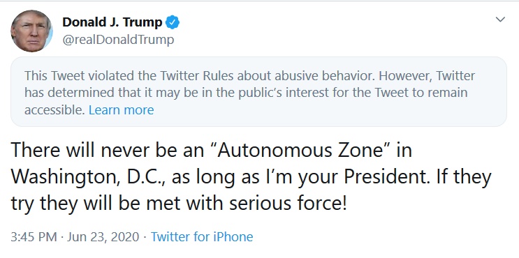 „Nu va exista niciodată o „zonă autonomă” în Washington, D.C., atât timp cât eu voi fi președintele vostru. Dacă vor încerca, se vor confrunta cu o forță serioasă”, a scris pe Twitter liderul de la Casa Albă, în contextul manifestațiilor împotriva violențelor poliției și a rasismului desfășurate în ultimele săptămâni în SUA.