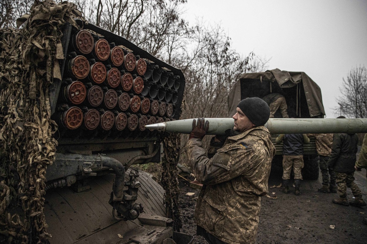 Soldați ucraineni care încarcă un lansator Grad în zona Bahmut, unde se duc lupte greleFoto: AA/ABACA / Abaca Press / Profimedia