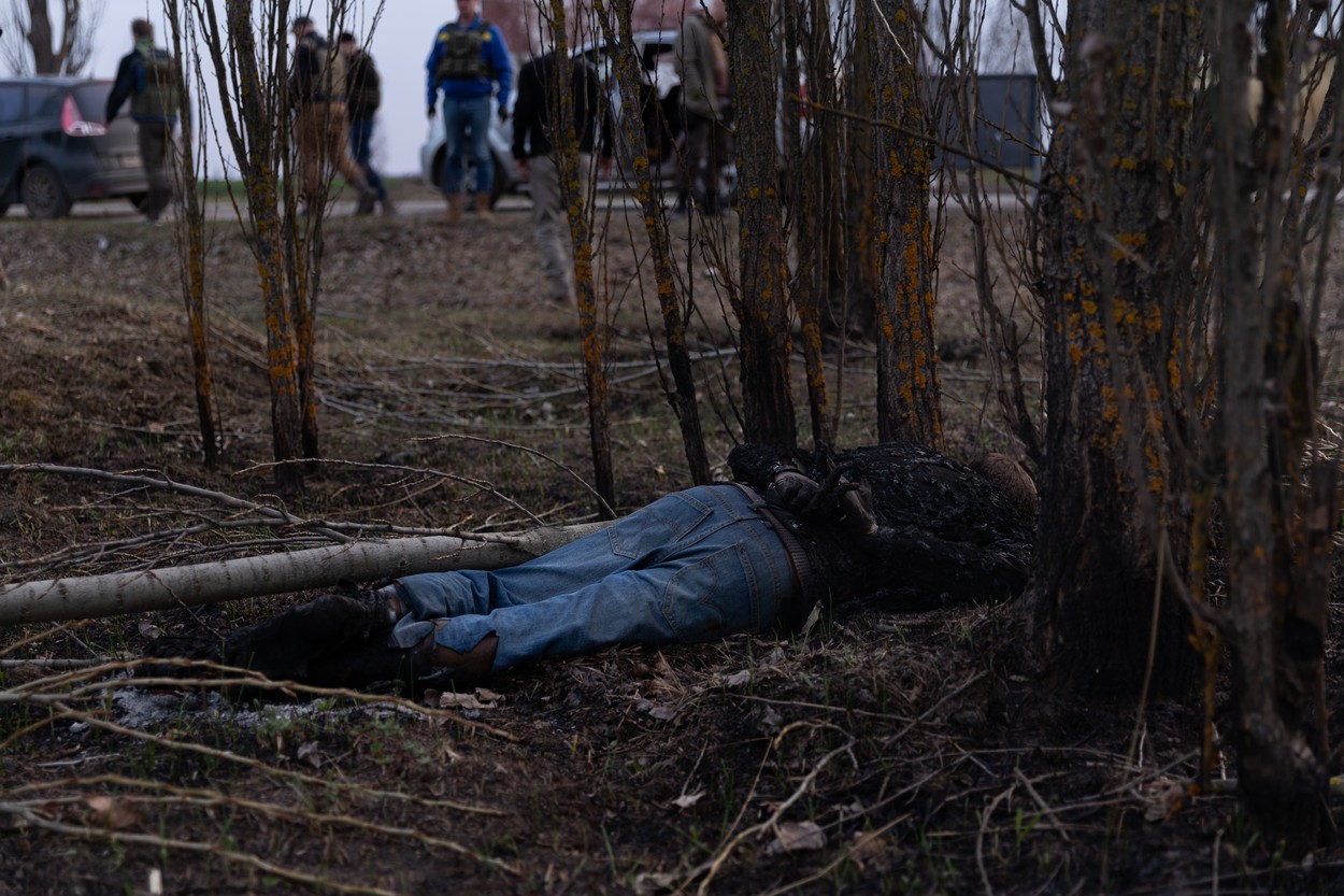 Trupul unui civil ucrainean, legat cu mâinile la spate, descoperit în apropiere de locul în care soldații ruși și-au instalat o tabăra militară, la MakarivFoto: Daniel Brown / ddp USA / Profimedia