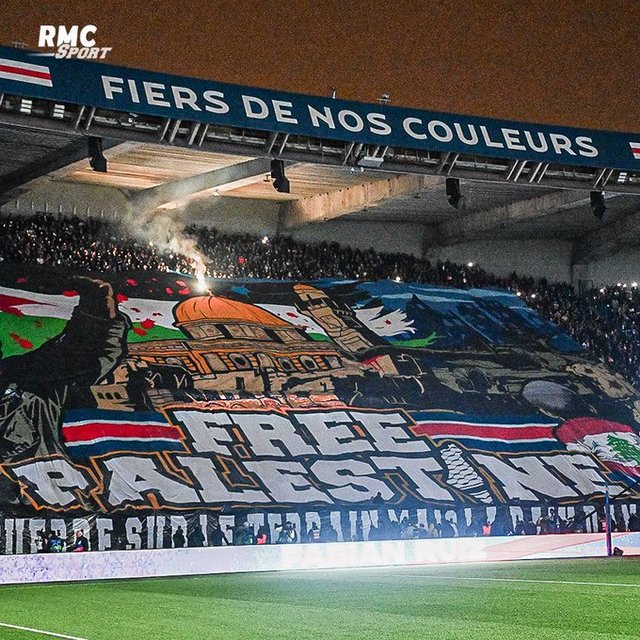 În tribuna Auteuil din Parc des Princes, de miercuri, a fost afişat un banner uriaş pe care scria: „Free Palestine”.