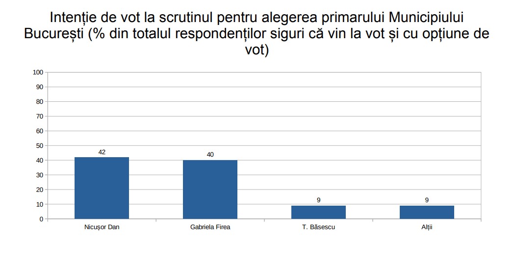 Astfel, candidatul dreptei este creditat cu 42% în intențiile de vot ale bucureștenilor, în vreme ce contracandidata sa de la PSD cu 40%. Pe locul trei este Traian Băsescu, de la PMP, pe care l-au indicat 9% dintre respondenți.