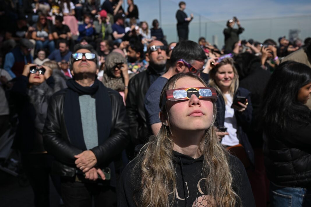 Persoane privind o eclipsă solară la New York în aprilie 2024 (imagine ilustrativă), FOTO: Erik Pendzich / Alamy / Profimedia Images