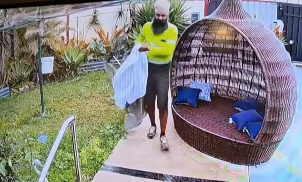 Gurpreet Singh, originar din India, este văzut în imagini cum ia rufele aflate la uscat, afară, pe sârmă și le pune la adăpost pentru că începuse să plouă chiar în momentul în care livra un colet la adresa din suburbia Logan, la sud de Brisbane, Australia, potrivit CNN.