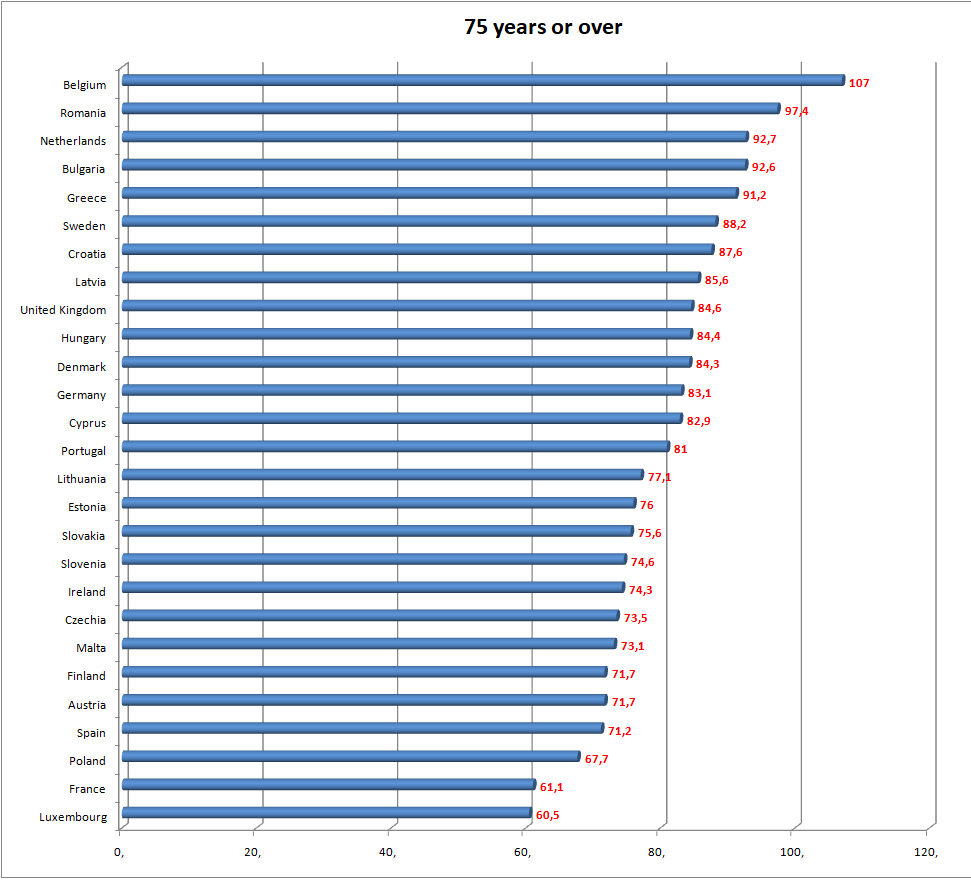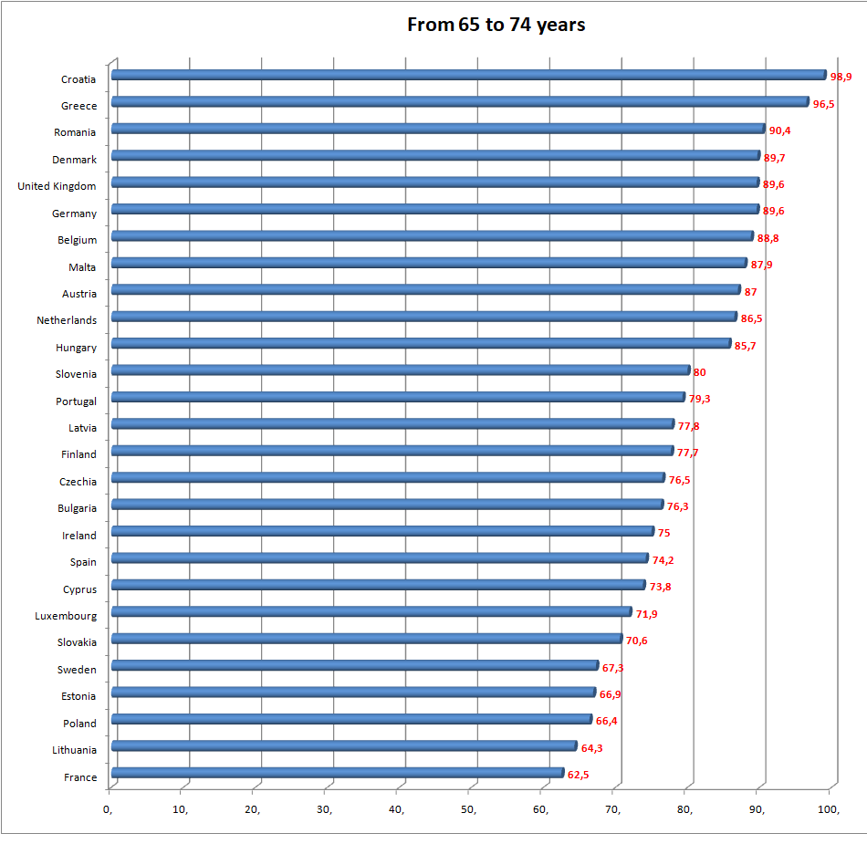Pentru cei cu vârsta 65-74 de ani, graficul statelor europene arată ca mai jos (click pentru a mări imaginea):