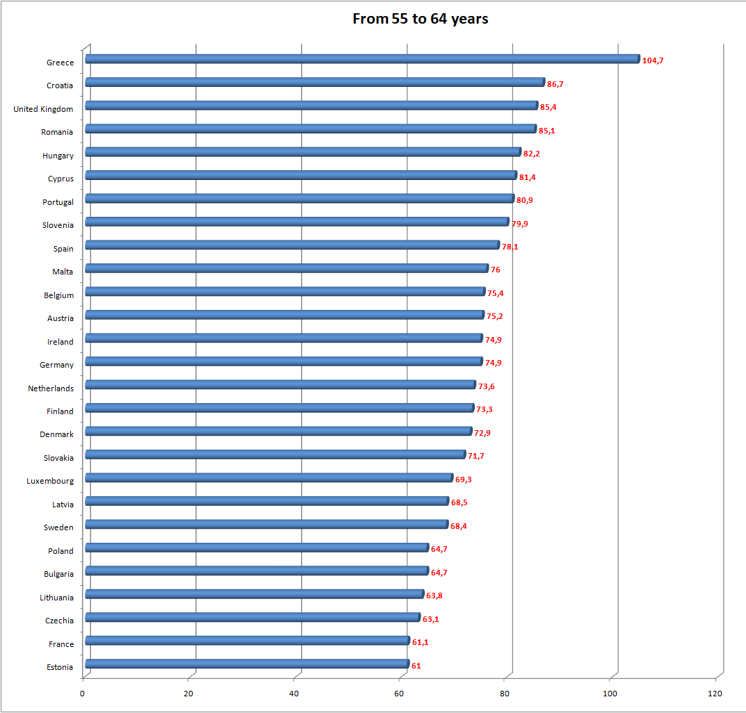 Pentru cei cu vârsta 55-64 de ani, graficul statelor europene arată ca mai jos (click pentru a mări imaginea):