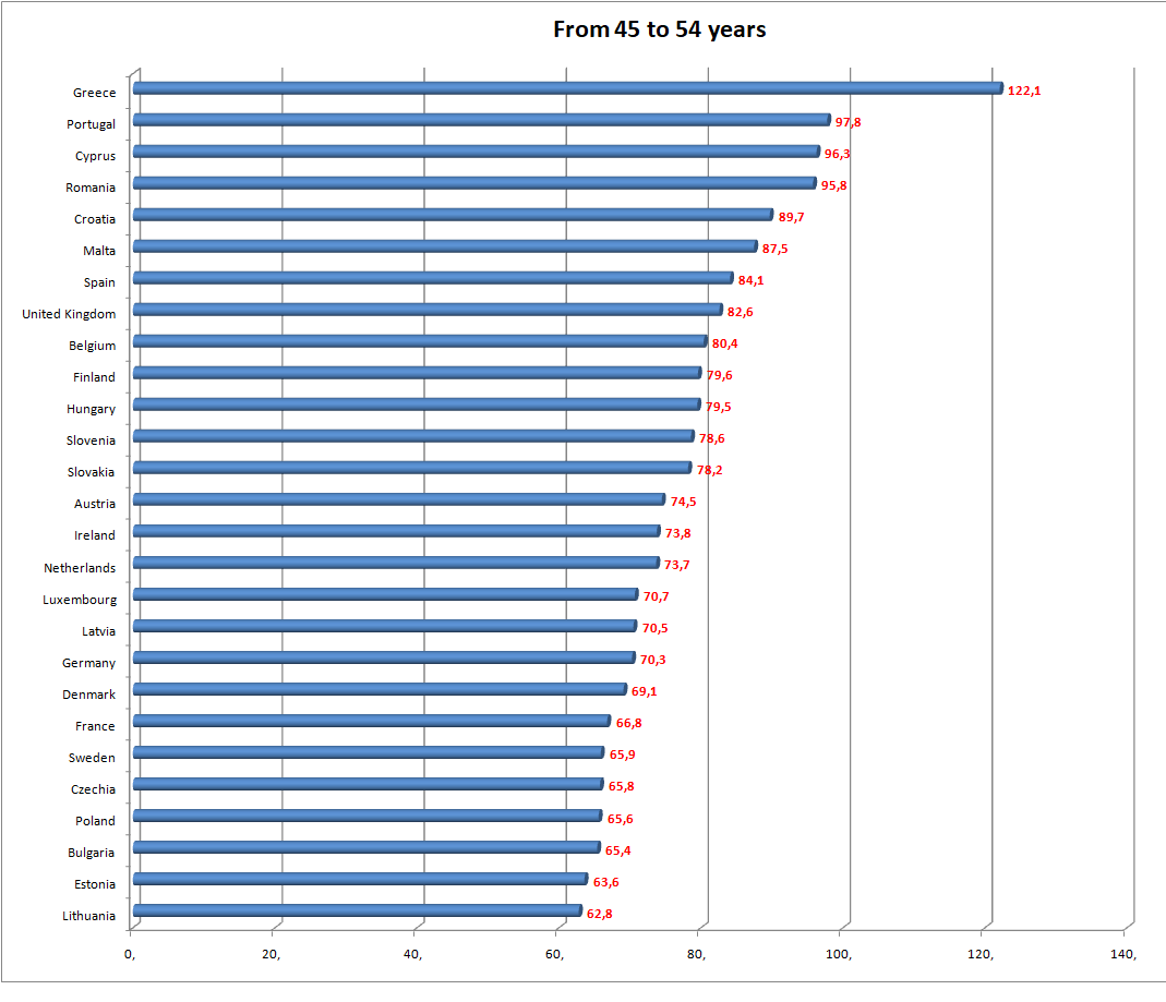 Pentru cei cu vârsta 45-54 de ani, graficul statelor europene arată ca mai jos (click pentru a mări imaginea):