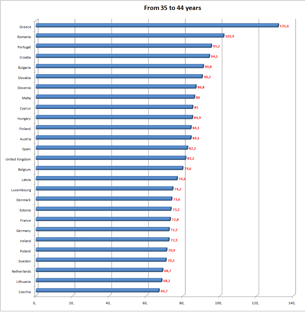 Pentru cei cu vârsta 35 -44 de ani, graficul statelor europene arată ca mai jos (click pentru a mări imaginea):