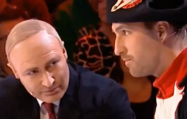 Susţinut de prezentatorul de platou, el îşi face apoi curaj şi-i spune falsului Putin că ”Vladimir, nu voi ezita, dacă va fi nevoie, să declar că, dacă Rusia îşi continuă drumul despletit spre provocarea paralizantă, voi pronunţa concomitent plauzibilitatea asumării datoriei care este a noastră, iar ăsta este proiectul nostru”.