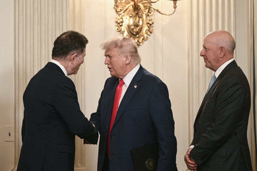 Michael Dell (stânga) alături de Donald Trump și David Solomon, CEO-ul băncii Goldman Sachs, la o întâlnire organizată de Casa Albă în iunie 2025 pe tema investițiilor în SUA, FOTO: Brendan Smialowski / AFP / Profimedia Images