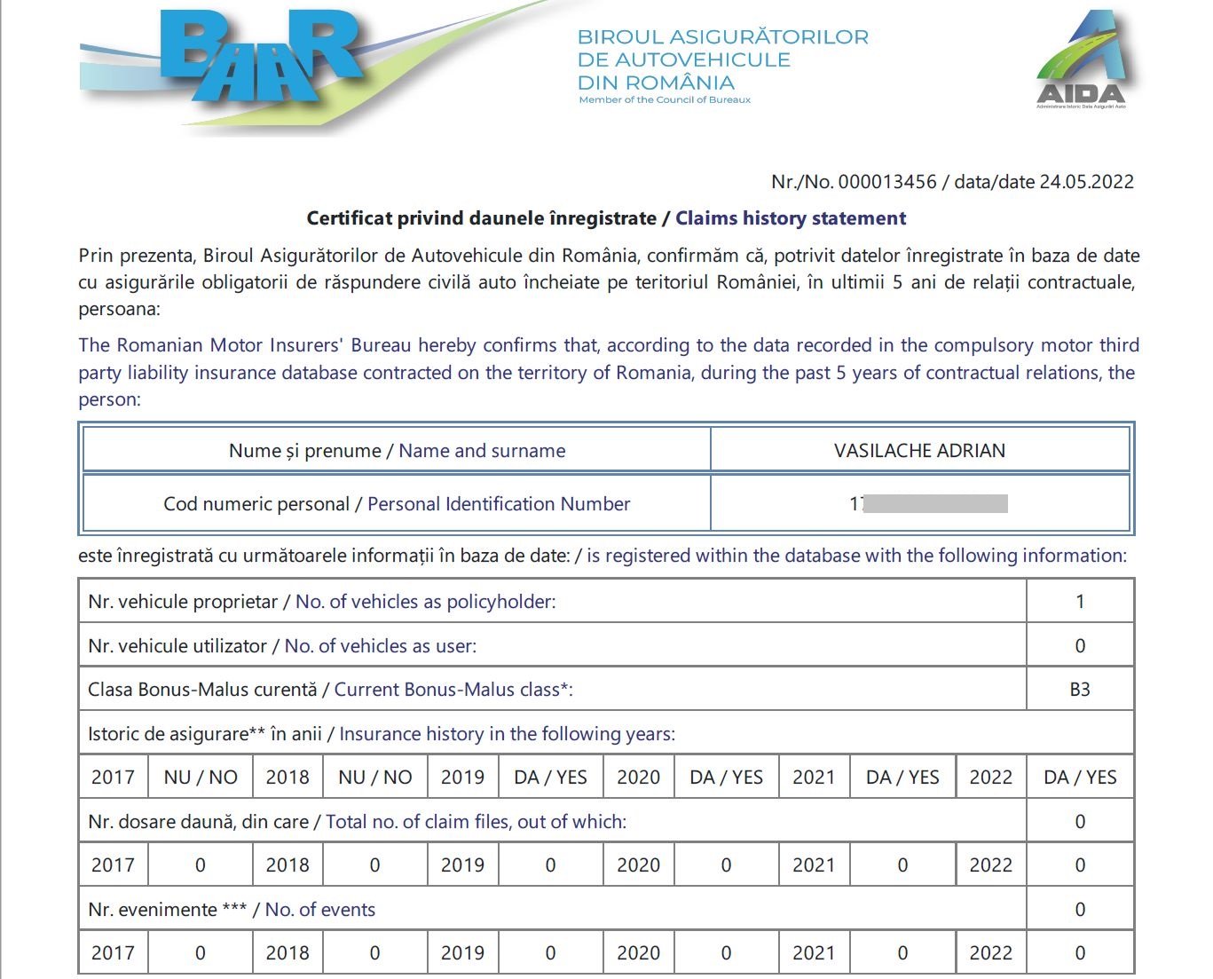 Șoferii români pot obține online, în câteva minute, certificatul de daunalitate al mașinii, un document generat din baza de date AIDA cu polițele RCA, care arată atât clasa de Bonus-Malus, cât și daunele înregistrate pe parcursul ultimilor 5 ani de asigurare. Totul prin intermediul unei aplicații lansate recent, în teste, de Biroul Asigurătorilor Auto, care poate fi utilizată atât pe iPhone-uri, cât și pe telefoane cu Android.