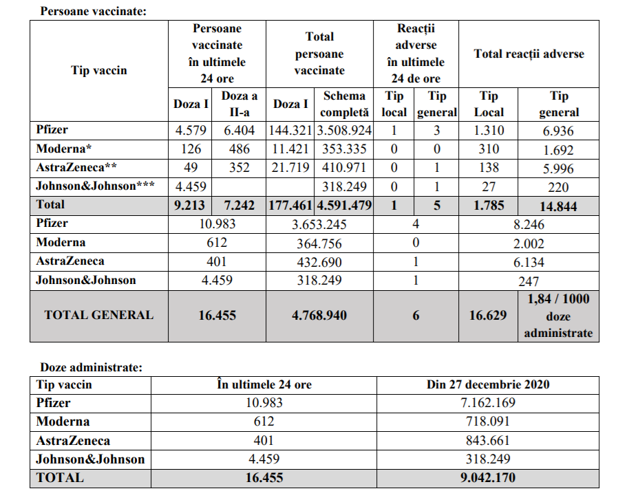 De la debutul campaniei de vaccinare, numărul persoanelor imunizate cu una sau două doze în România a ajuns la 4.768.940 .