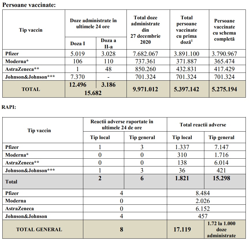 În ultimele 24 de ore s-au înregistrat 8 reacții adverse, 4 la Pfizer și 4 la Johnson&Johnson. De la debutul campaniei de vaccinare, numărul total al reacțiilor adverse a fost de 17.119 (1,72/1000 doze administrate). Alte 70 de reacții adverse sunt în curs de investigare.