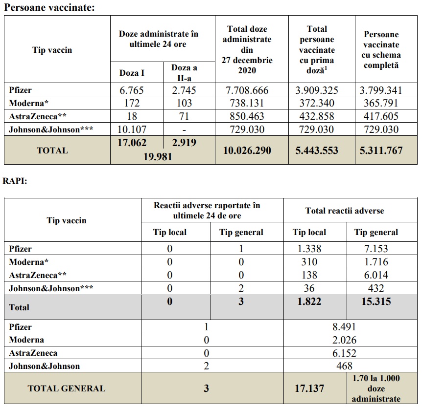În ultimele 24 de ore s-au înregistrat 3 reacții adverse, 1 la Pfizer și 2 la Johnson&Johnson. De la debutul campaniei de vaccinare, numărul total al reacțiilor adverse a fost de 17.137 (1,70/1000 doze administrate). Alte 74 de reacții adverse sunt în curs de investigare.
