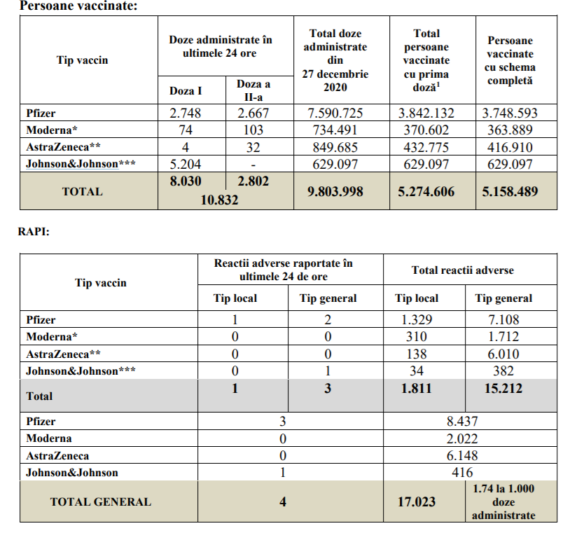 De asemenea, în ultimele 24 de ore, s-au înregistrat 4 reacții adverse, dintre care 3 la Pfizer și 1 la Johnson & Johnson.