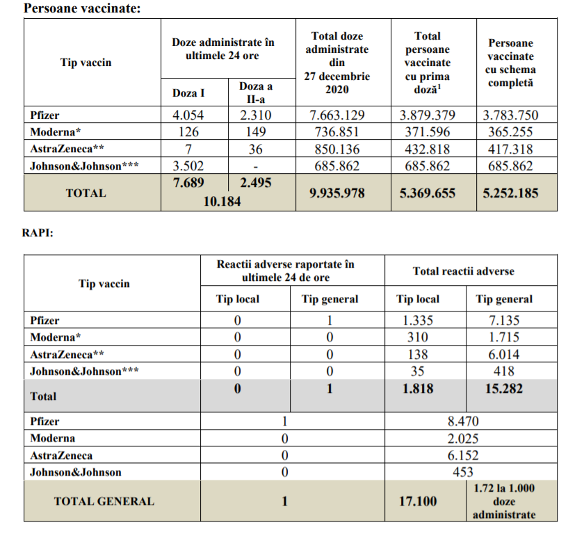 Numărul total al dozelor administrate de la debutul campaniei de vaccinare a ajuns la 9.935.978, în timp ce numărul persoanelor vaccinate cu schema completă a ajuns la 5.252.185.