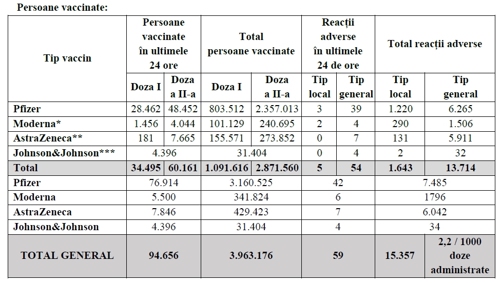 Peste 94.000 de persoane au fost vaccinate în ultimele 24 de ore anti-Covid în România. Dintre acestea 76.914 au fost imunizate cu Pfizer, 5.500 cu Moderna, 4.396 cu Johnson&Johnson și 7.846 cu AstraZeneca a anunțat Comitetul Naţional pentru Coordonarea Vaccinării anti-COVID. În total, de la debutul campaniei de vaccinare, aproape 4 milioane de persoane au fost inoculate cu unul dintre vaccinuri și au fost administrate peste 6,8 milioane de doze de vaccin.Conform informațiilor transmise luni seară de Comitetul Național de Coordonare a Activităților privind Vaccinarea împotriva COVID-19 (CNCAV), în ultimele 24 de ore au fost administrate 94.656 de doze, dintre care 34.495 ca primă doză și 60.161 de doze ca rapel.