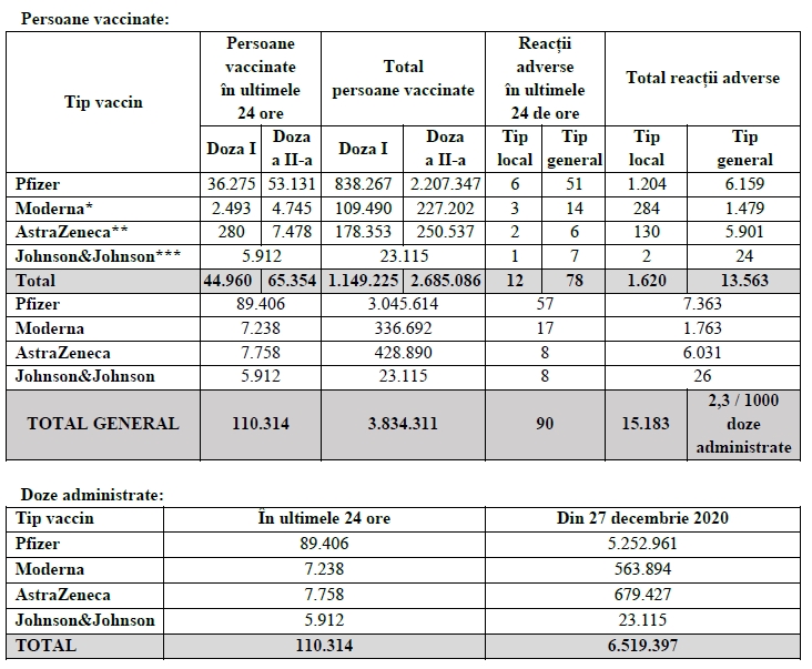 Conform informațiilor transmise vineri seară de Comitetul Național de Coordonare a Activităților privind Vaccinarea împotriva COVID-19 (CNCAV), în ultimele 24 de ore au fost administrate 110.314 de doze, dintre care 44.960 ca primă doză și 65.354 de doze ca rapel.