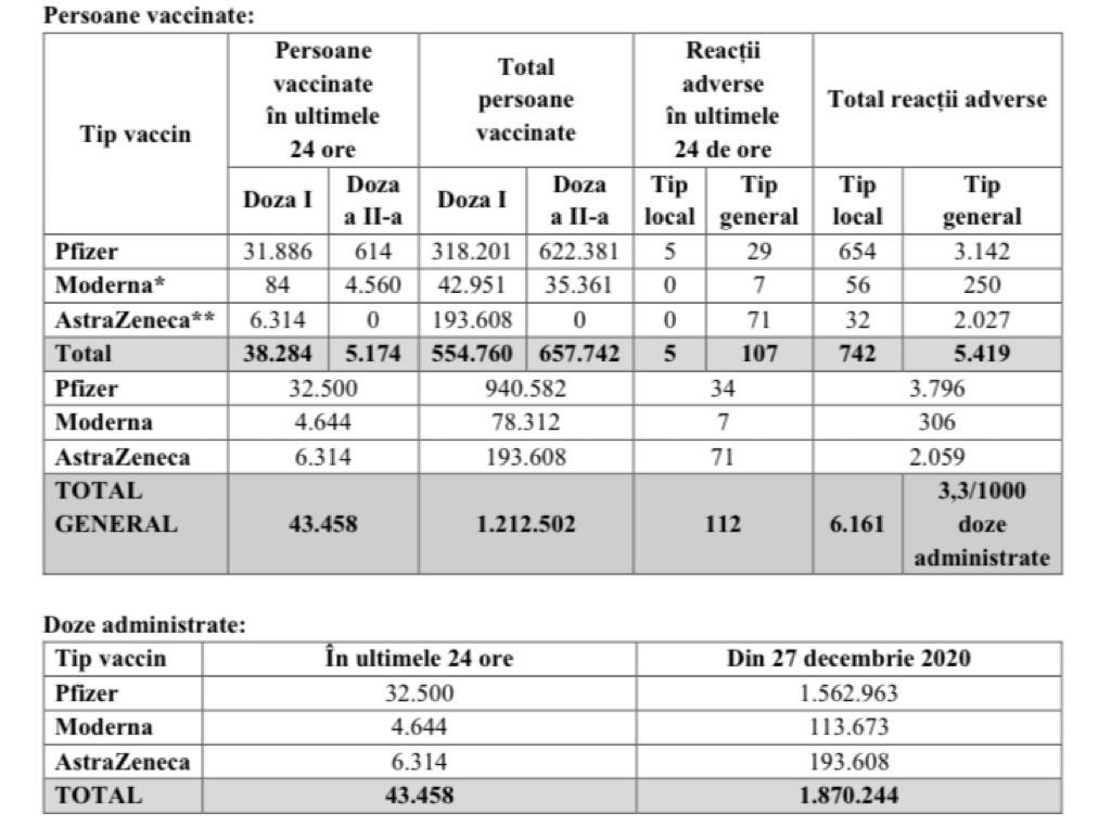 Conform sursei citate, de la debutul campaniei de vaccinare au fost vaccinate 1.212.502 de persoane, iar 6.161 au avut reacții adverse. Cei mai muți români – 940.582 – au fost vaccinați cu vaccinul Pfizer, 193.608 au primit serul AstraZeneca, iar 78.312 au fost vaccinați cu Moderna.