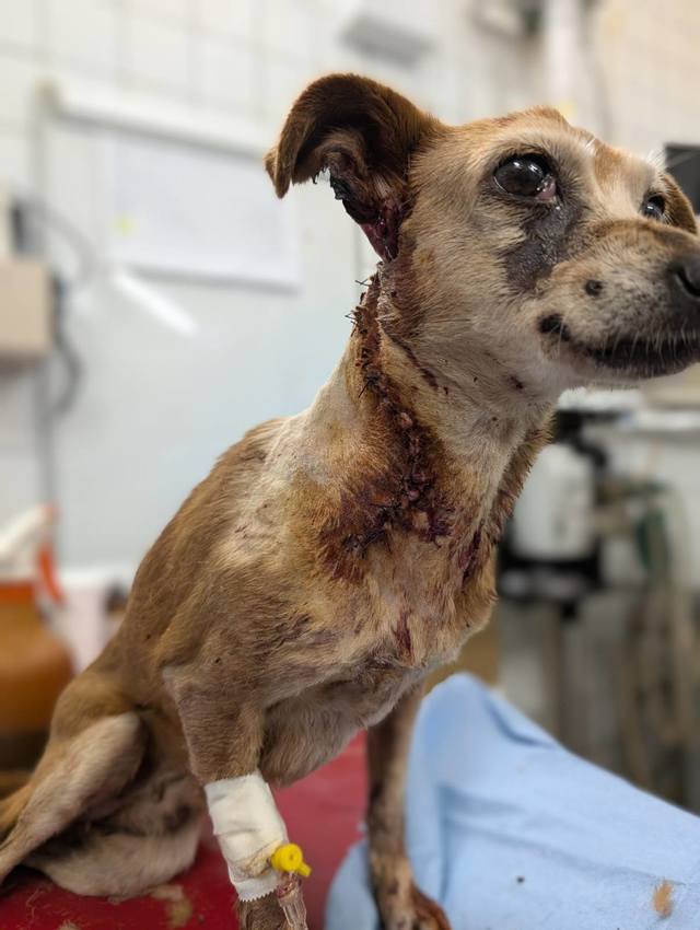 ”Câinele din imagini a fost găsit în urmă cu o săptămână de către poliţişti de la Poliţia Locală a Municipiului Bucureşti în zona bulevardului George Coşbuc din Sectorul 5. Câinele avea o rană deschisă, de mari dimensiuni, în zona gâtului, astfel încât a fost solicitat de urgenţă un echipaj de intervenţie ASPA cu medic. În cel mai scurt timp câinele a ajuns la adăpostul ASPA Bragadiru unde a fost evaluat de echipa medicală şi a primit imediat îngrijire medicală de specialitate. S-a stabilit că este vorba despre o femelă în vârstă de aproximativ 12 ani, cu o stare generală alterată de şocul suferit şi de pierderea unei canitităţi mari de sânge. Nu prezenta urme vizibile de muşcături, ci mai degrabă părea că rana a fost produsă prin sfâşiere”, a transmis, joi, ASPA Bucureşti.