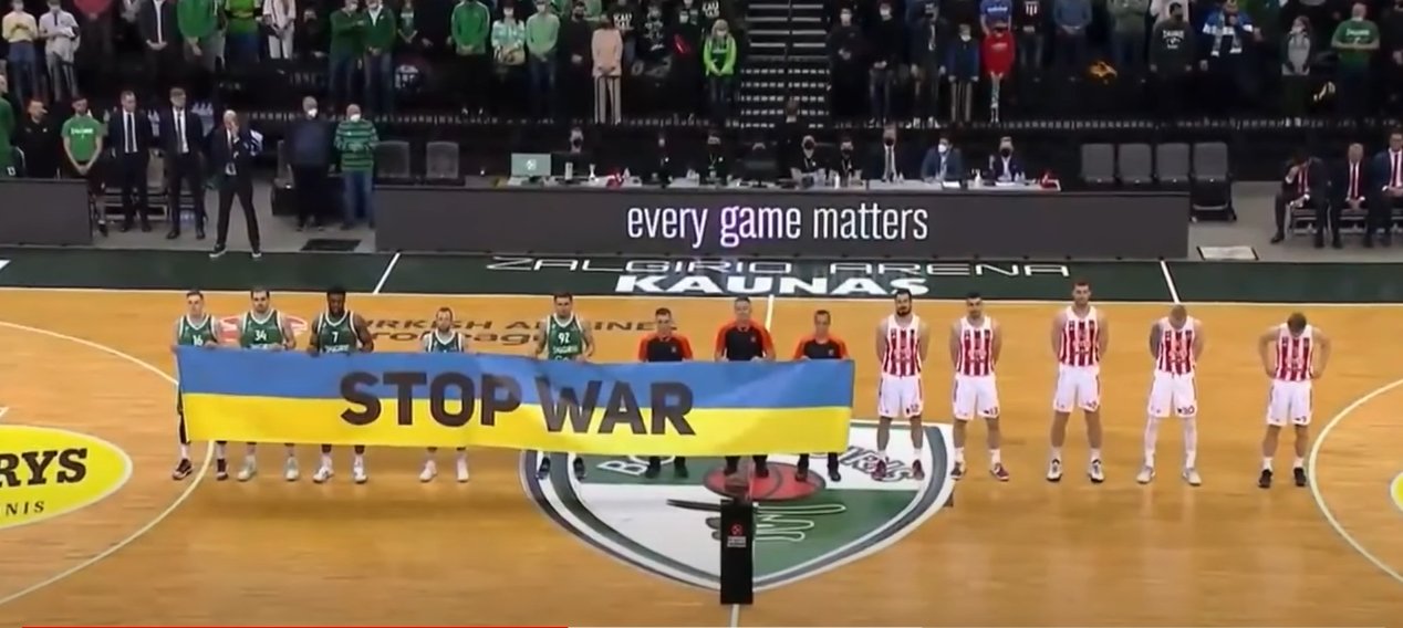 Meciul dintre Zalgiris Kaunas și Steaua Roșie Belgrad din Euroliga masculină de baschet a avut parte de multă tensiune înainte de startul efectiv al partidei. Jucătorii oaspeților au refuzat să fie asociați cu mesajul „Stop war”, iar întreaga scenă a adus un val de indignare în tribune în rândul fanilor lituanieni.
