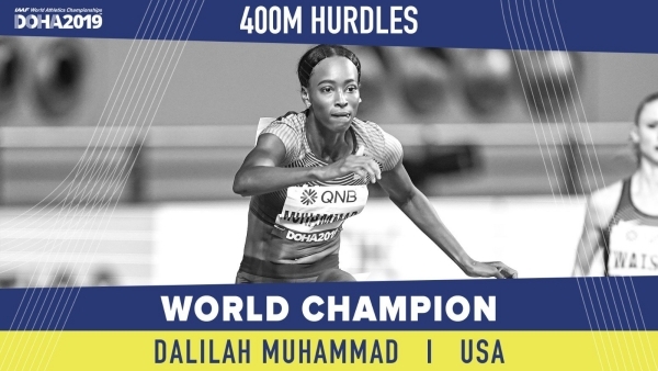 uD83CuDDFAuD83CuDDF8 goes 1-2 as Dalilah Muhammad breaks own 400m hurdles world record in 52.16 on way to #WorldAthleticsChamps gold. @GoSydGo clocks impressive 52.23 for silver.