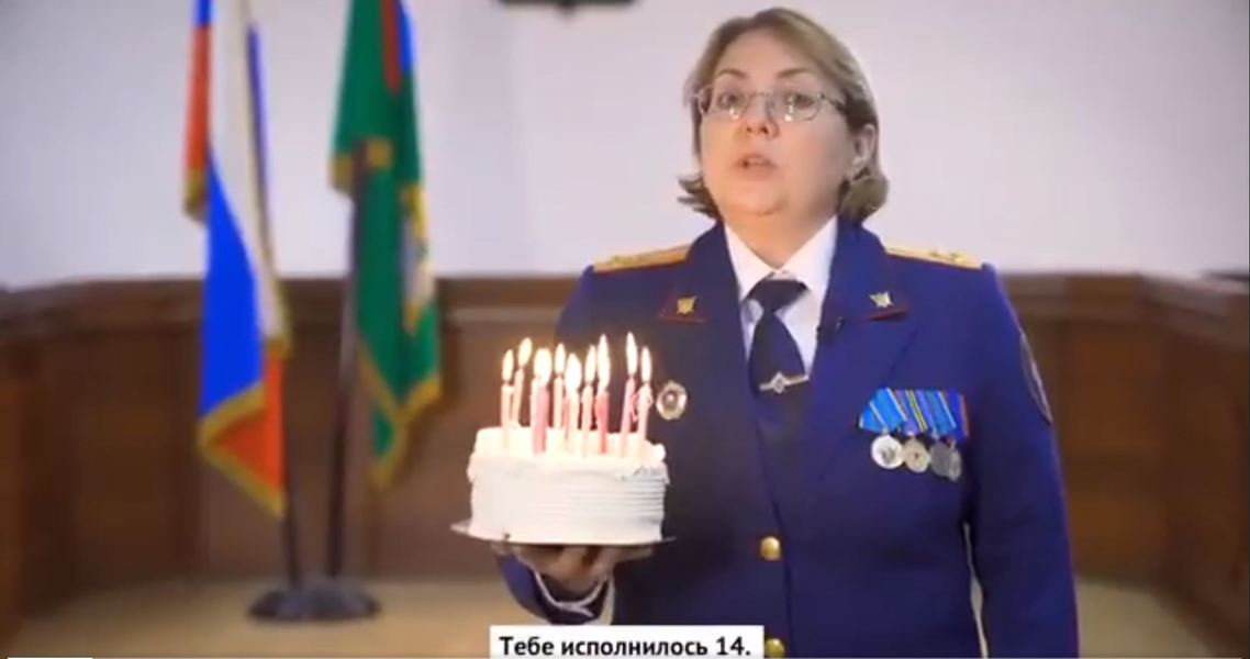 ”Ai făcut 14 ani? Felicitări!”, spune o polițistă în uniformă ce ține un tort cu lumânări, într-un clip video publicat joi de Comitetul de Investigații din Moscova.