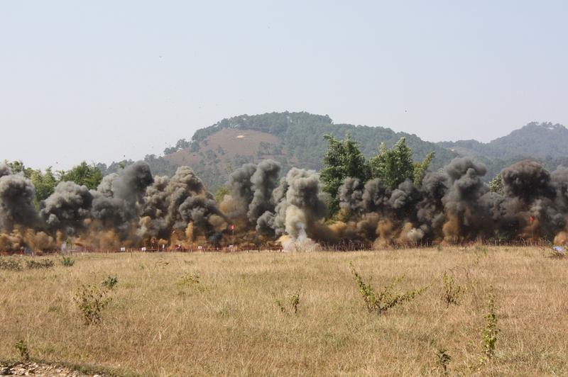 Utile în special în atacurile asupra trupelor aflate în tranşee, muniţiile cu dispersie (sau cu fragmentaţie) explodează în aer deasupra unei ţinte, eliberând zeci de submuniţii pe o arie extinsă, dar unele dintre ele nu explodează şi devin pe termen lung o ameninţare pentru populaţia civilă, la fel ca minele.